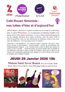 Café Rouen féministe 2026-01-19T20:30:30+01:0019 janvier 2026|Catégories : À LA UNE|Mots-clés : COMMUNIQUÉS, DÉBATS| Partagez cet article ! FacebookXWhatsAppTelegramEmail Articles similaires La FSU76 répond à la demande d’information syndicale La FSU76 répond à la demande d’information syndicale 19 janvier 2026 Le 22 janvier l’Assemblée nationale doit rejeter l’attaque du 1er mai, seul jour obligatoirement chômé et payé Le 22 janvier l’Assemblée nationale doit rejeter l’attaque du 1er mai, seul jour obligatoirement chômé et payé 12 janvier 2026 Stage intersyndical RESF 10 MARS 2026 Stage intersyndical RESF 10 MARS 2026 11 janvier 2026 Stage LGBTQIA+ – Mardi 17 mars à Rouen Stage LGBTQIA+ – Mardi 17 mars à Rouen 11 janvier 2026 Ensemble pour la paix et le droit du peuple vénézuelien a vivre loin de l’impérialisme Ensemble pour la paix et le droit du peuple vénézuelien a vivre loin de l’impérialisme 8 janvier 2026