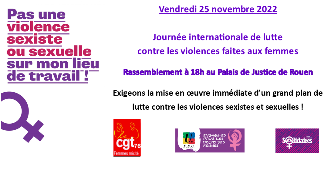 Ce vendredi 25 novembre 2022, avec toutes les femmes du monde, soyons tou·te·s ensemble mobilisé·e·s pour dire stop aux violences psychologiques, physiques, économiques ou sexuelles faites aux femmes. La CGT, la FSU et Solidaires appellent à se rassembler à Rouen pour exiger la mise en œuvre immédiate d’un grand plan de lutte contre les violences sexistes et sexuelles.