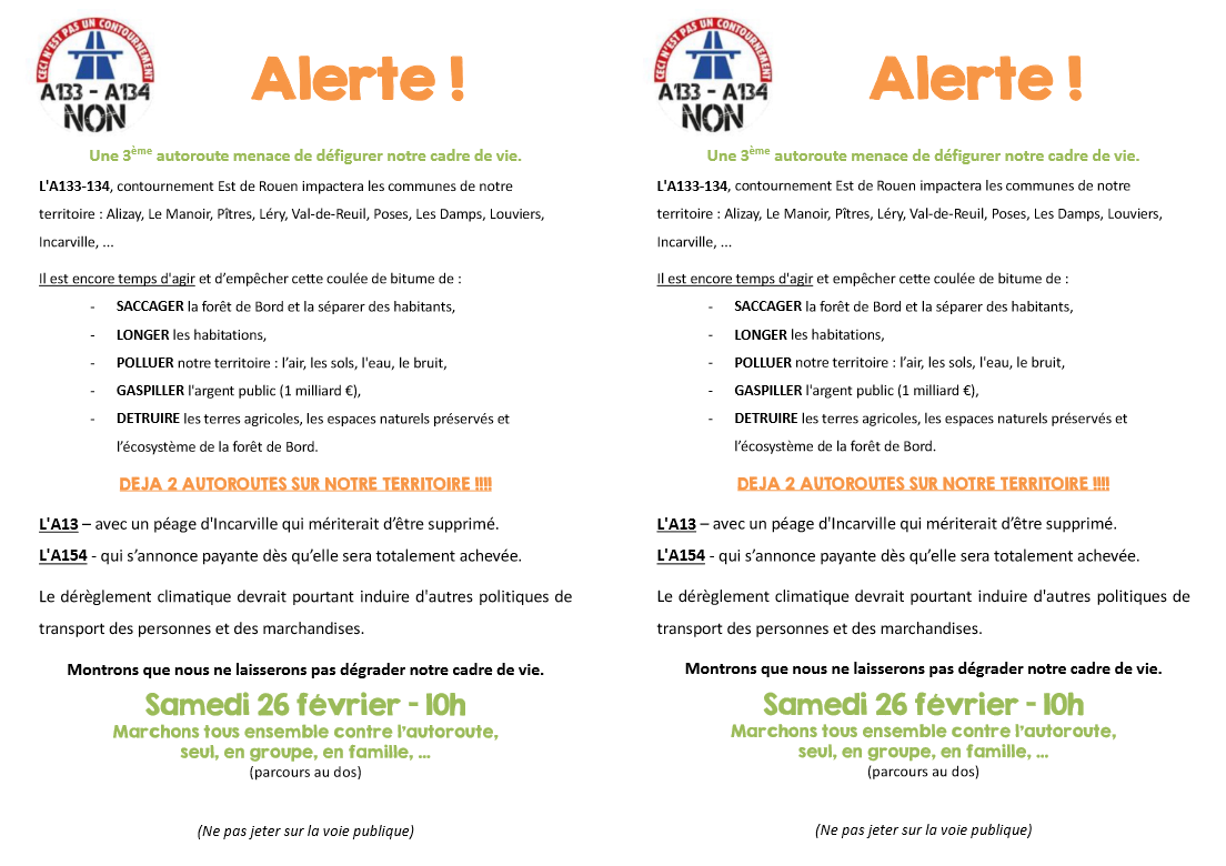 Elle sera donc présente lors de la marche organisée le samedi 26 février 2022 à 10h dans l’Eure (deux départs prévus) pour dire non à l’autoroute A133-A134.